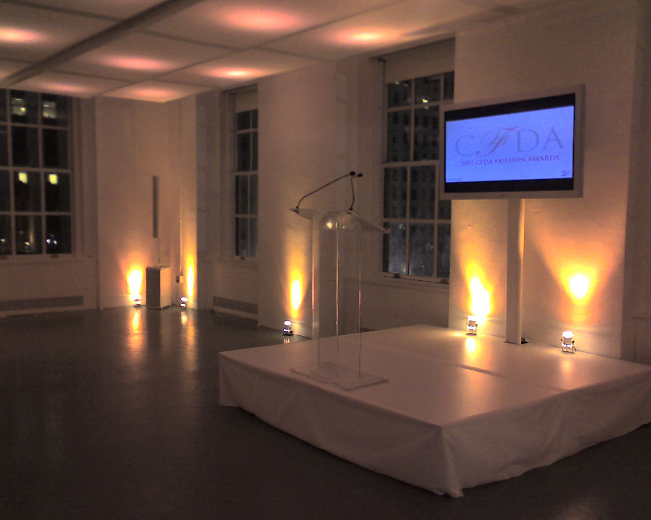 (In the above picture we provided the white stage, plasma TV, podium, microphone, and our custom-designed white tower speaker in the corner)